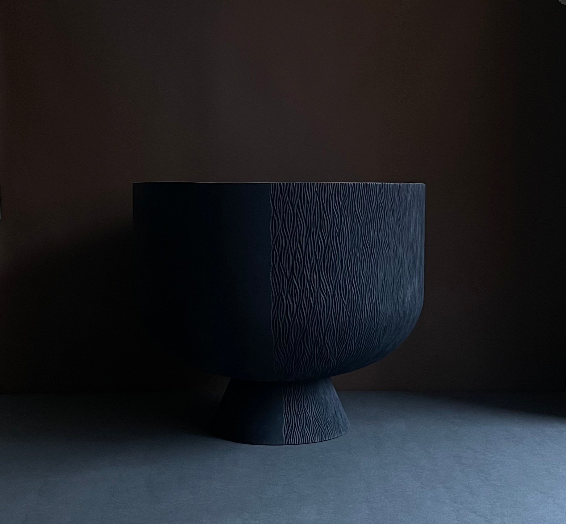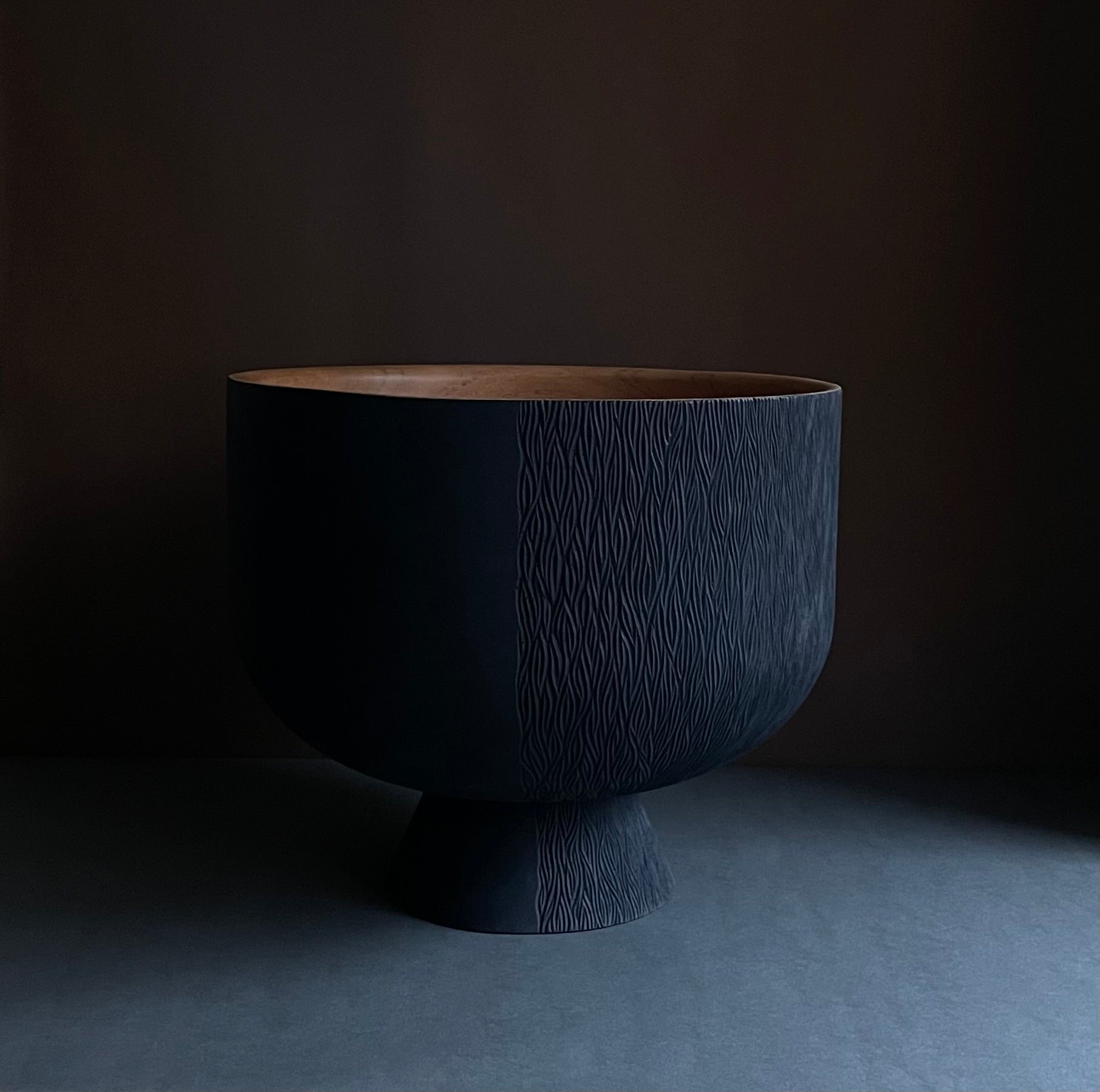 Pieza elaborada en madera cedro del putumayo, torneada y tallada a mano con texturas de patrones geométricos inspirados en la arquitectura.