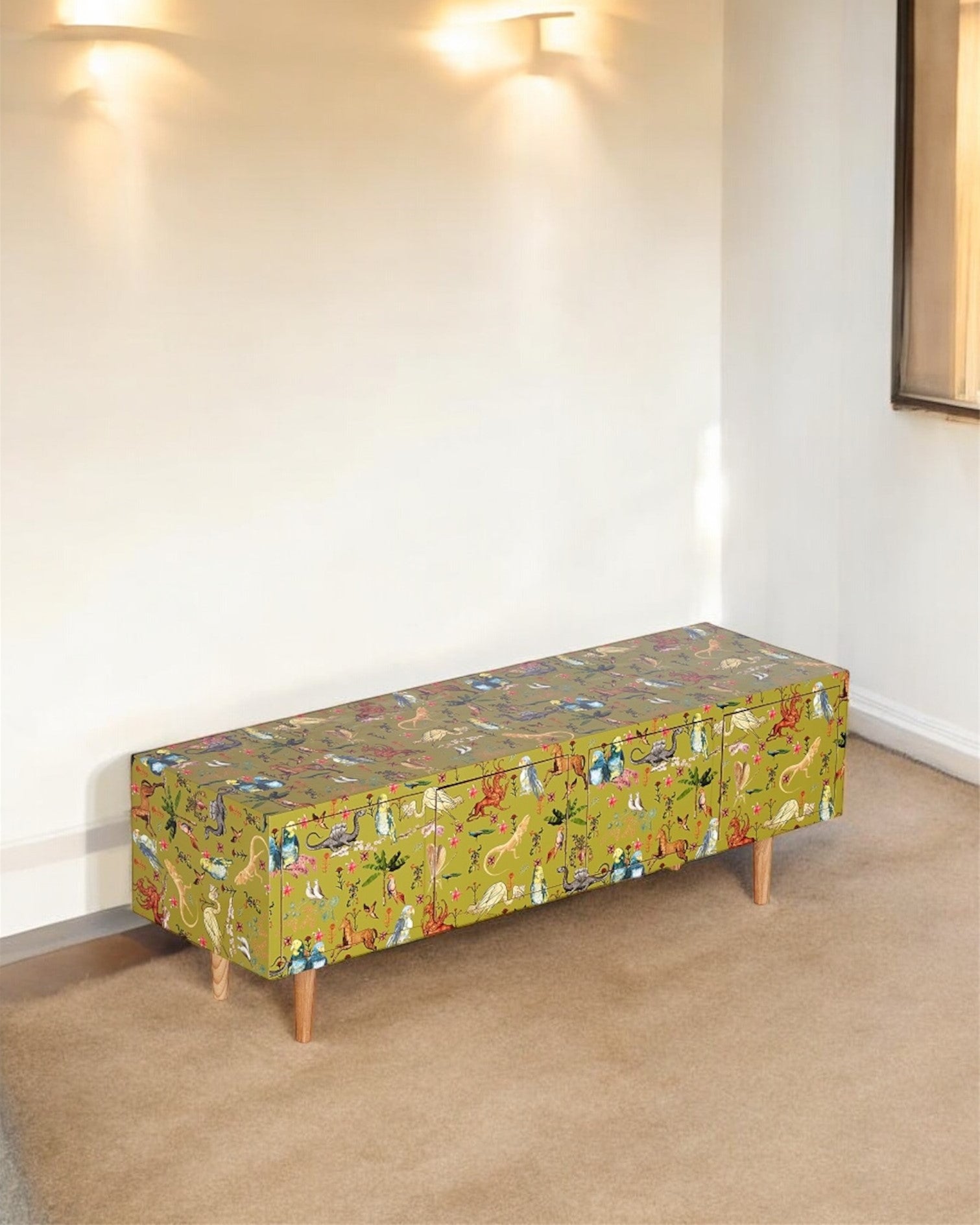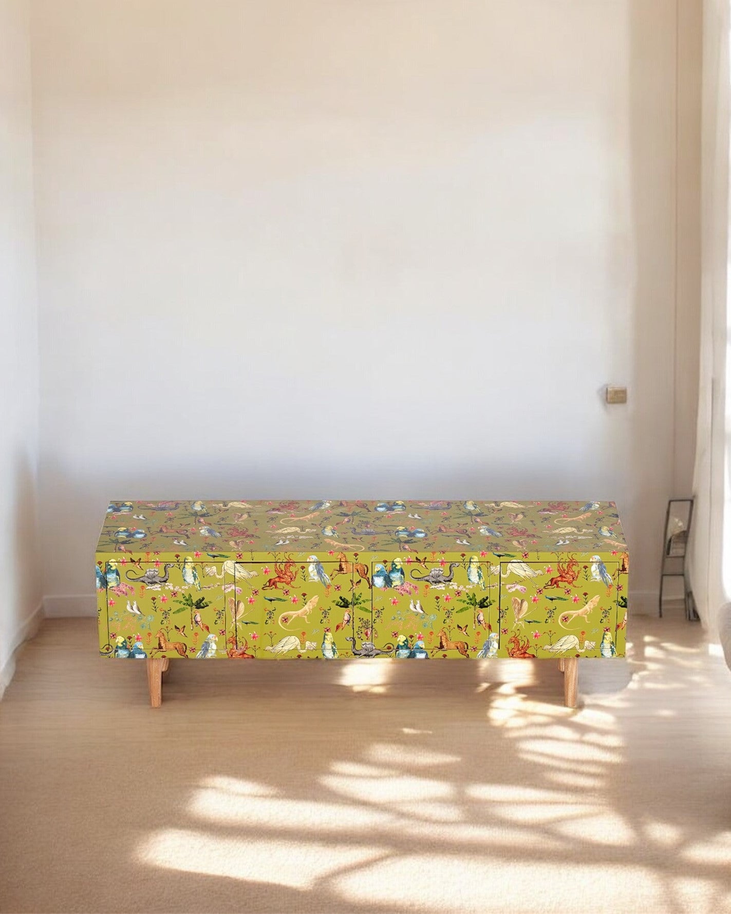 Este aparador elaborado en madera maciza flor morado y acabados en papel de alta calidad con diseño gráfico único, es el mueble ideal para todo tipo de espacio. Pieza de extremo gusto y elegancia, imprime carácter e identidad al espacio. Tiempo de entrega: 30 días