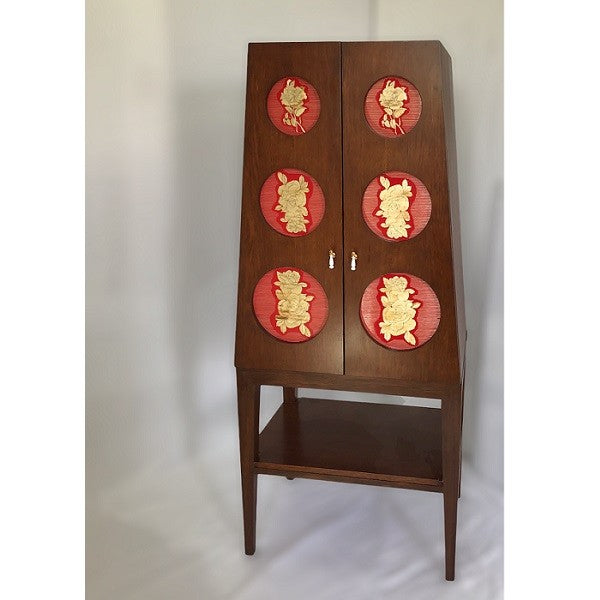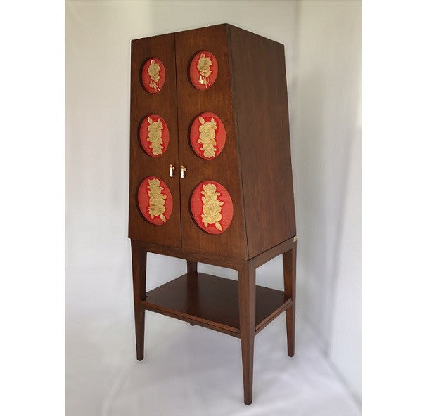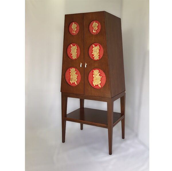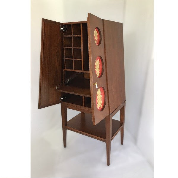 La textura de madera con intervención de enchape en Tamo, artesanía de Pasto, Nariño; le imprimen a este vajillero bar un lenguaje de vanguardia. Pieza hecha a mano y con las tradiciones de la antigua ebanistería, es la pieza de amoblamiento cargada de geometría y diseño.