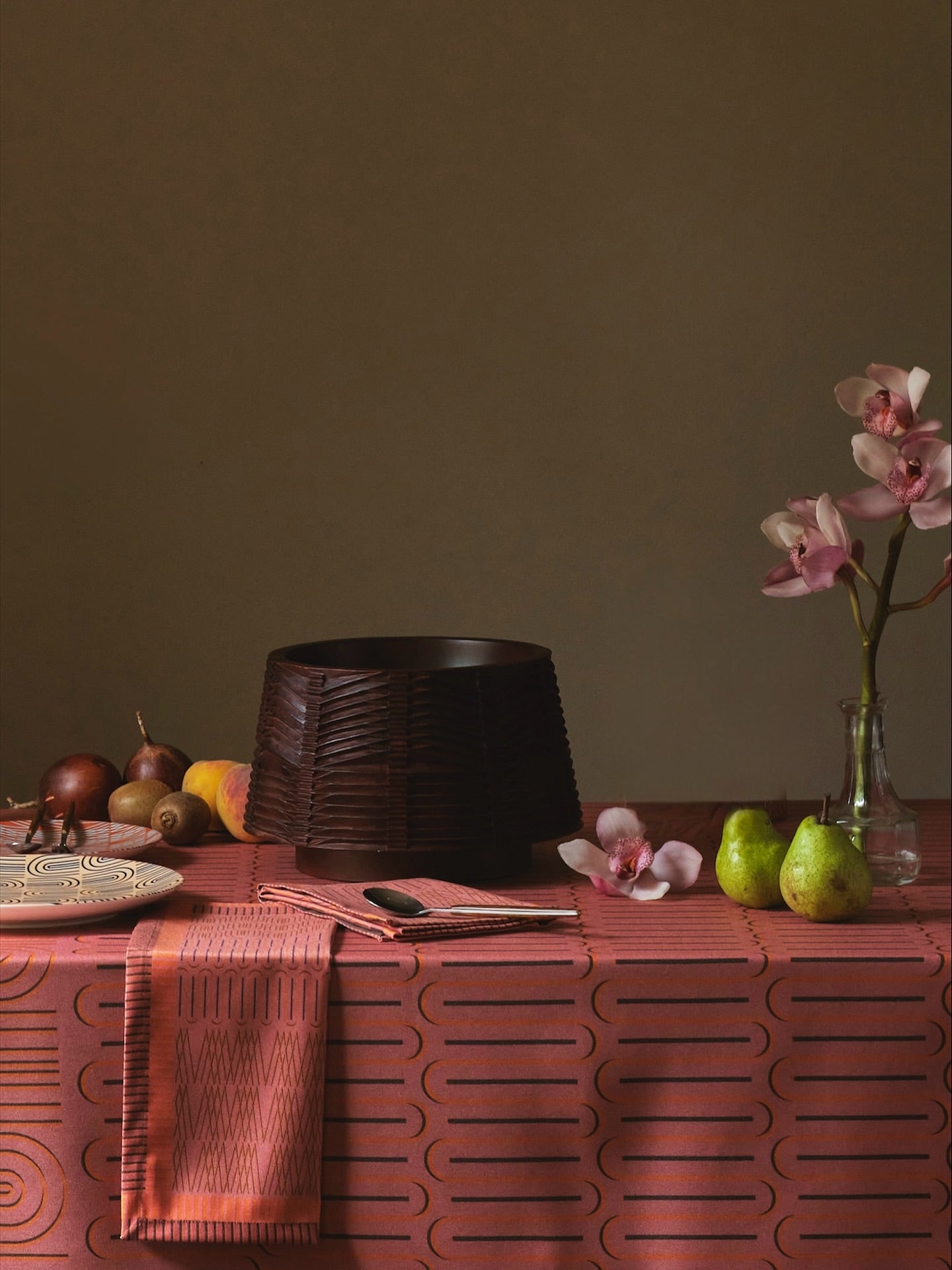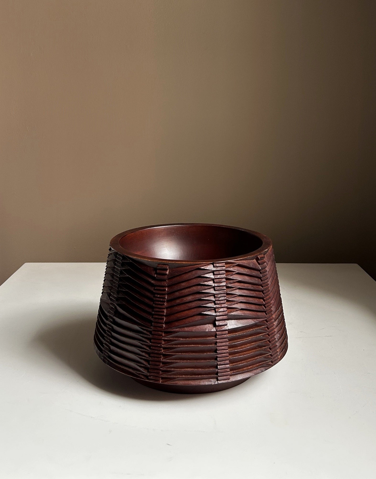 Pieza elaborada en madera cedro del putumayo, torneada y tallada a mano con texturas de patrones geométricos inspirados en la arquitectura. Pieza de la colección ESPACIO, TIEMPO, FORMA Y LUGAR 2025. Disponible para entrega inmediata