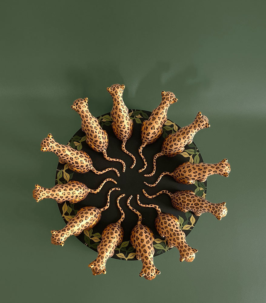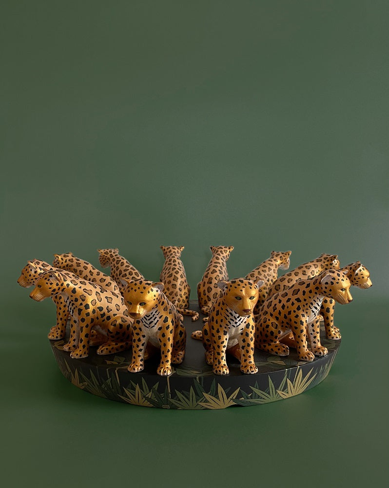 Centro de mesa elaborado en madera torneada, cada jaguar es una pieza de madera tallada a mano, decorado con la técnica artesanal del Barniz de Pasto - Mopa/Mopa.Pieza de la colección artesanal Selvas Andinas.Tiempo de entrega máximo: 65 días