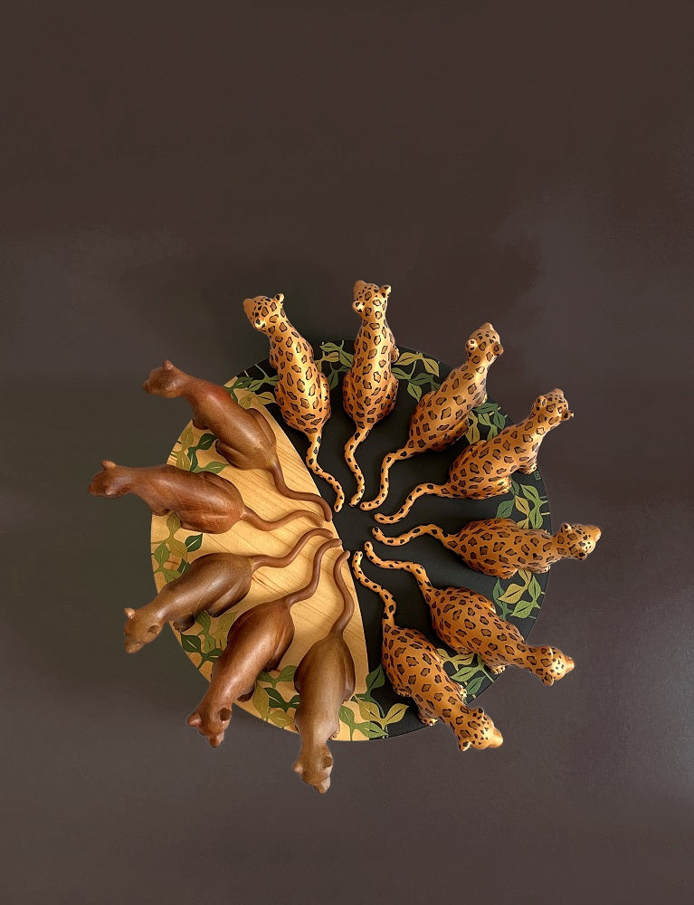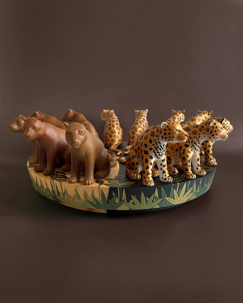 Centro de mesa elaborado en madera torneada, cada jaguar es una pieza de madera tallada a mano, decorado con la técnica artesanal del Barniz de Pasto - Mopa/Mopa.Pieza de la colección artesanal Selvas Andinas.Tiempo de entrega máximo: 65 días