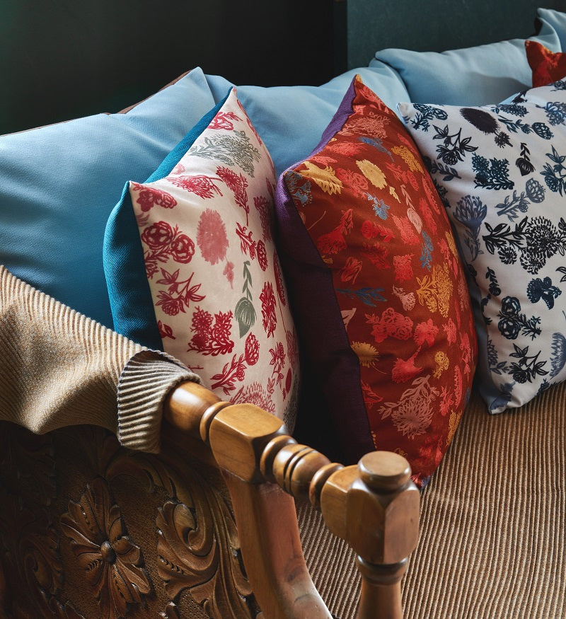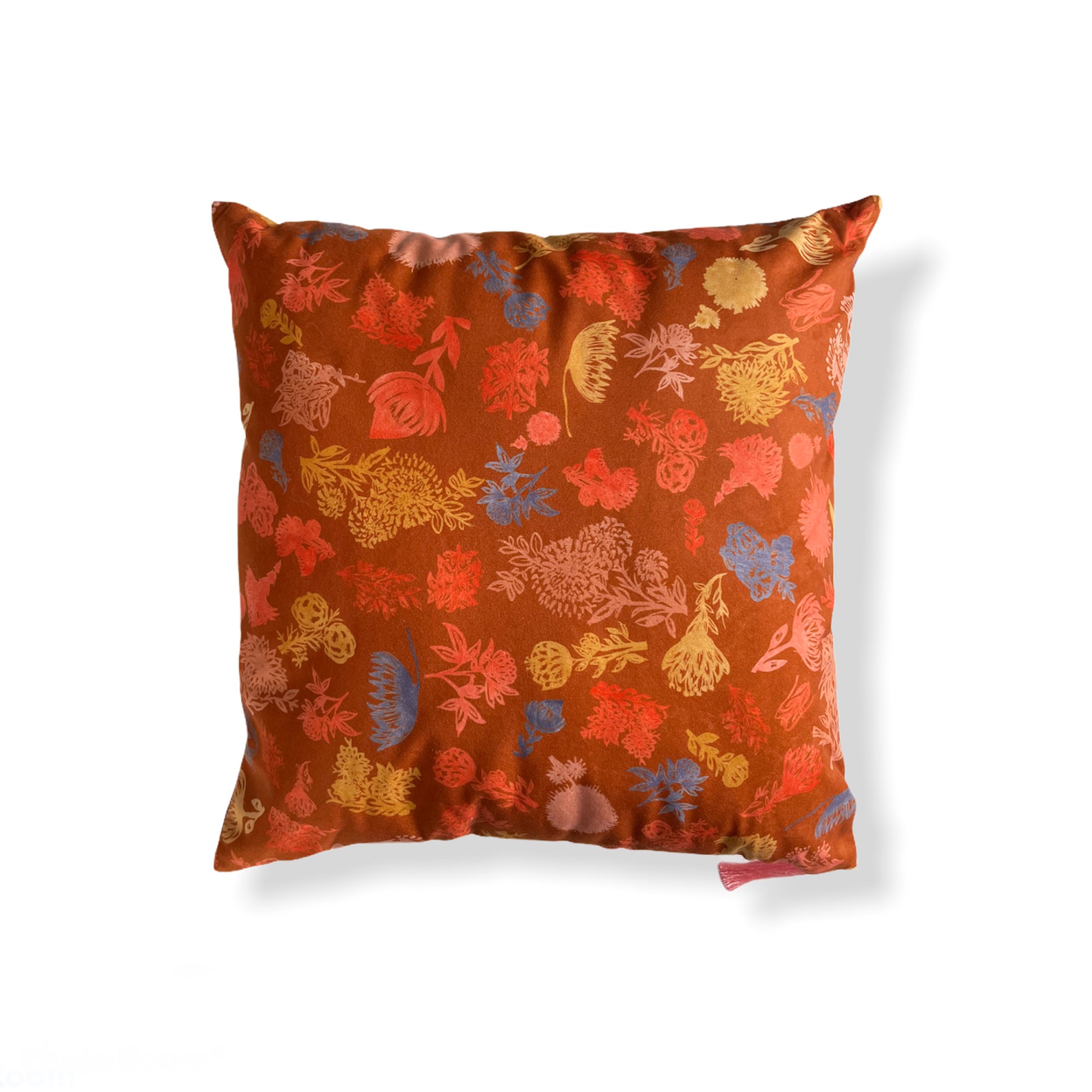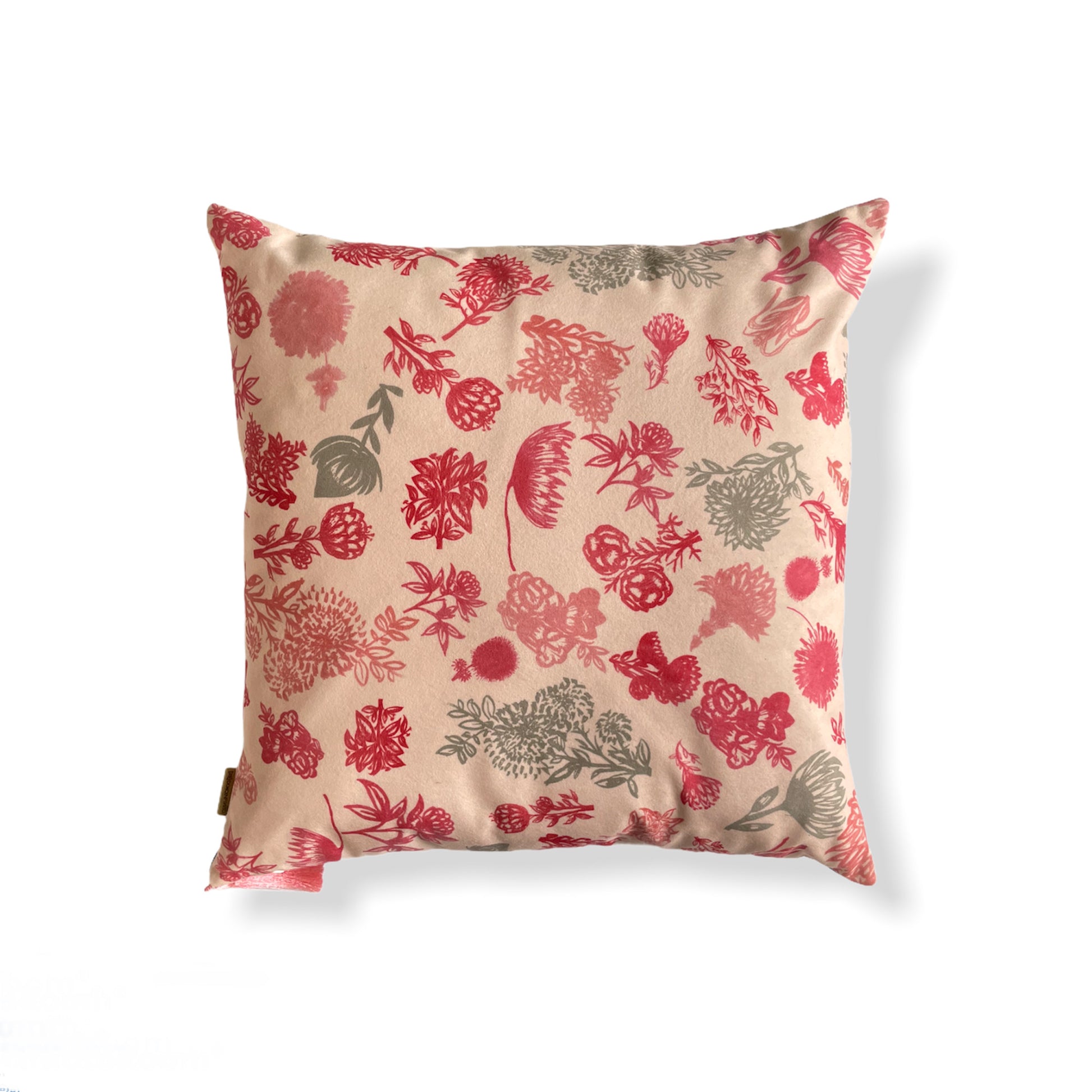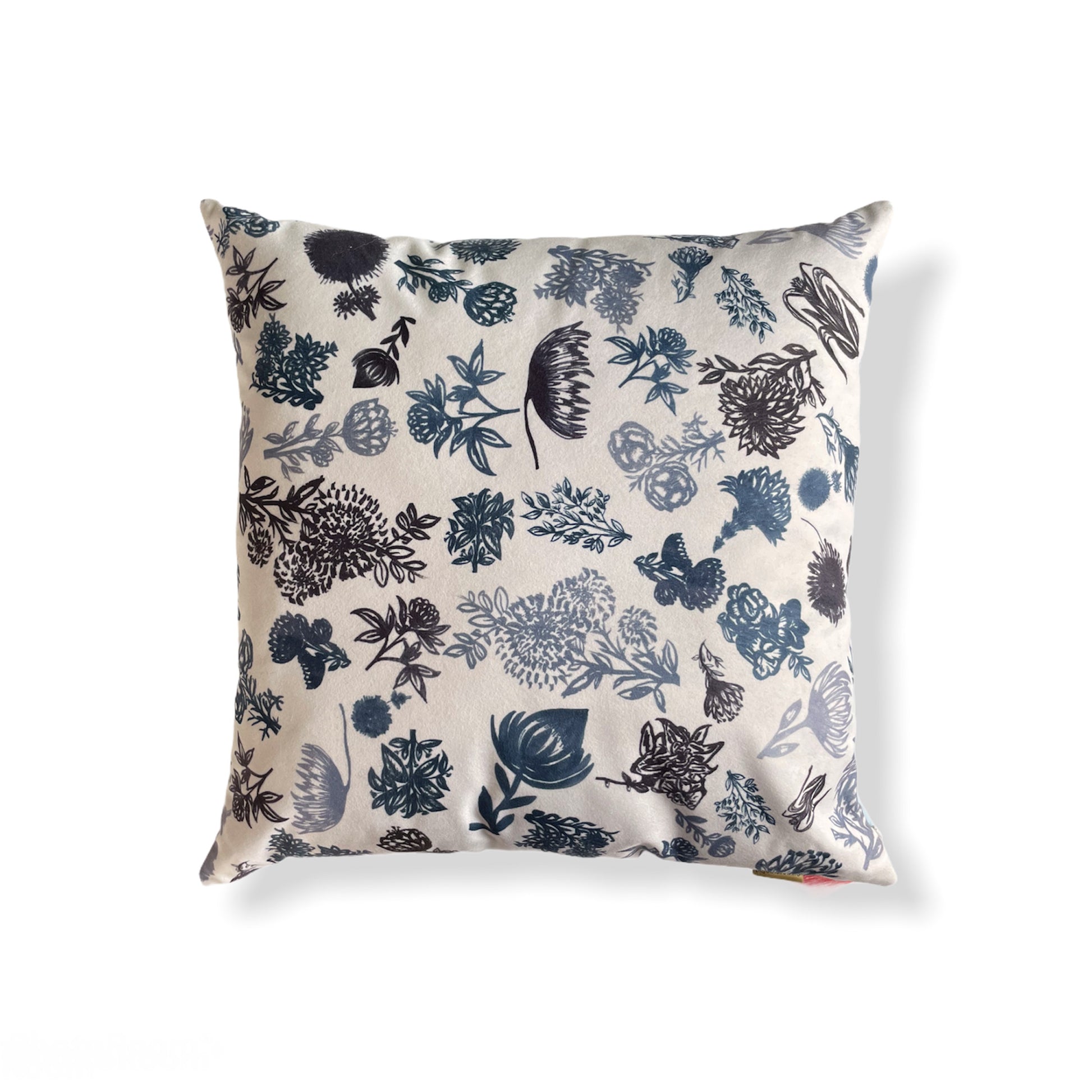 La creación de los patrones gráficos e ilustraciones de esta colección, parte de un dibujo a mano con tinta, trazo detallado de lo que queda en la memoria sobre la imagen de flores, ramas y arbustos presentes en ese Bosque Andino ubicado en 2.800 y 3.200 metros de altitud característico de los Cerros Orientales de Bogotá. El Bosque de Niebla se presenta como un ambiente húmedo, que se aprecia a la distancia como el característico manto de nubes que cubre la cumbre de las montañas andinas. Cojín en tela tipo terciopelo 100% polyester.