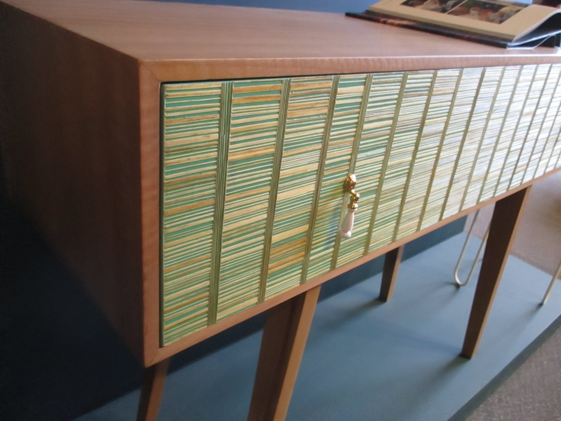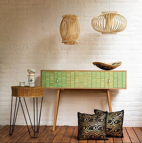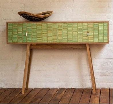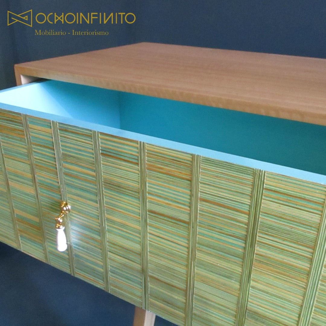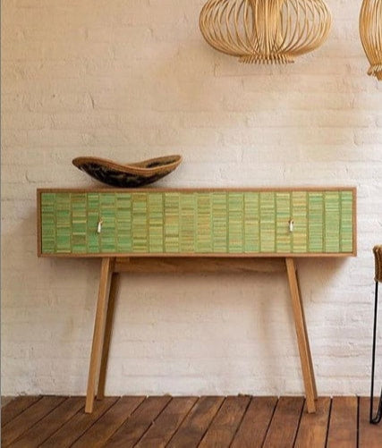 La textura de madera con intervención de enchape en Tamo, artesanía de Pasto, Nariño; le imprimen a esta consola un lenguaje de vanguardia. Pieza hecha a mano y con las tradiciones de la antigua ebanistería, es la pieza de amoblamiento cargada de geometría y diseño.