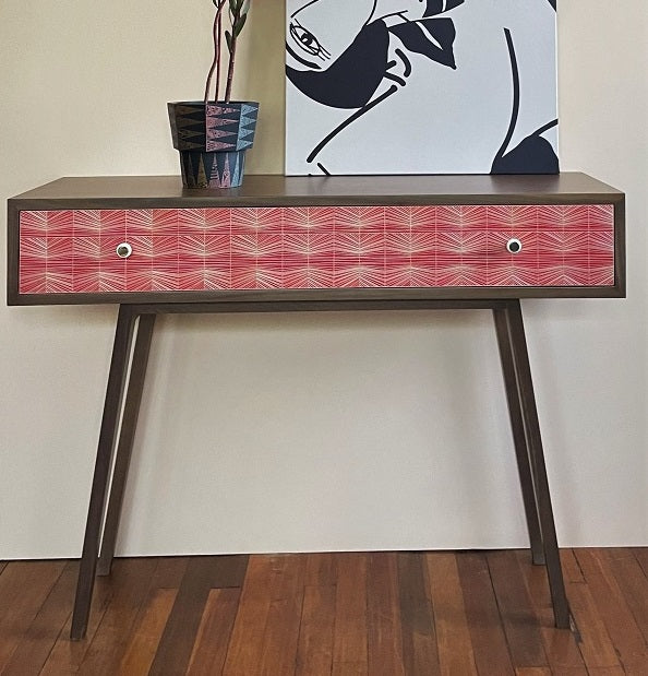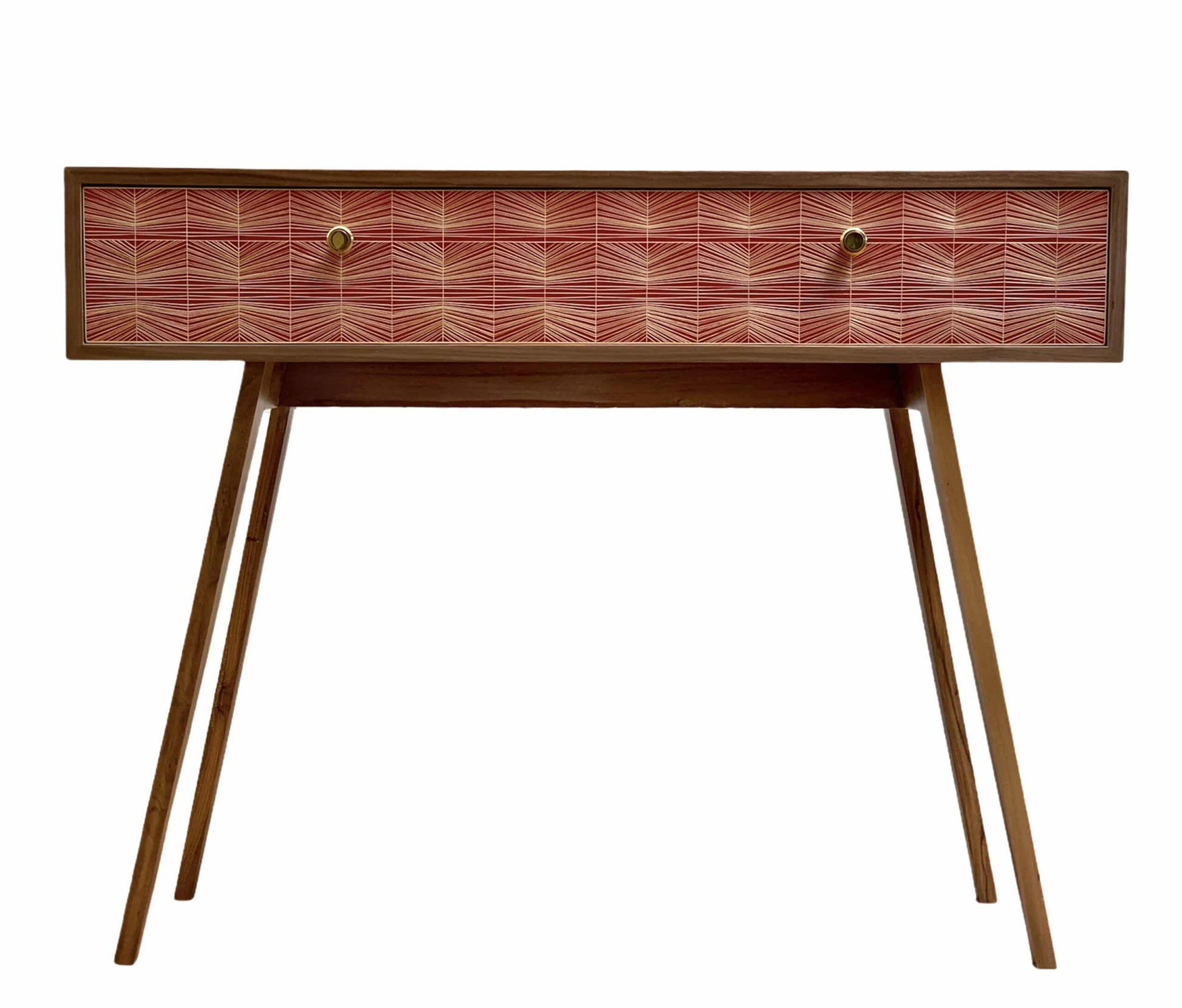 La textura de madera con intervención de enchape en Tamo, artesanía de Pasto, Nariño; le imprimen a esta consola un lenguaje de vanguardia. Pieza hecha a mano y con las tradiciones de la antigua ebanistería, es la pieza de amoblamiento cargada de geometría y diseño.