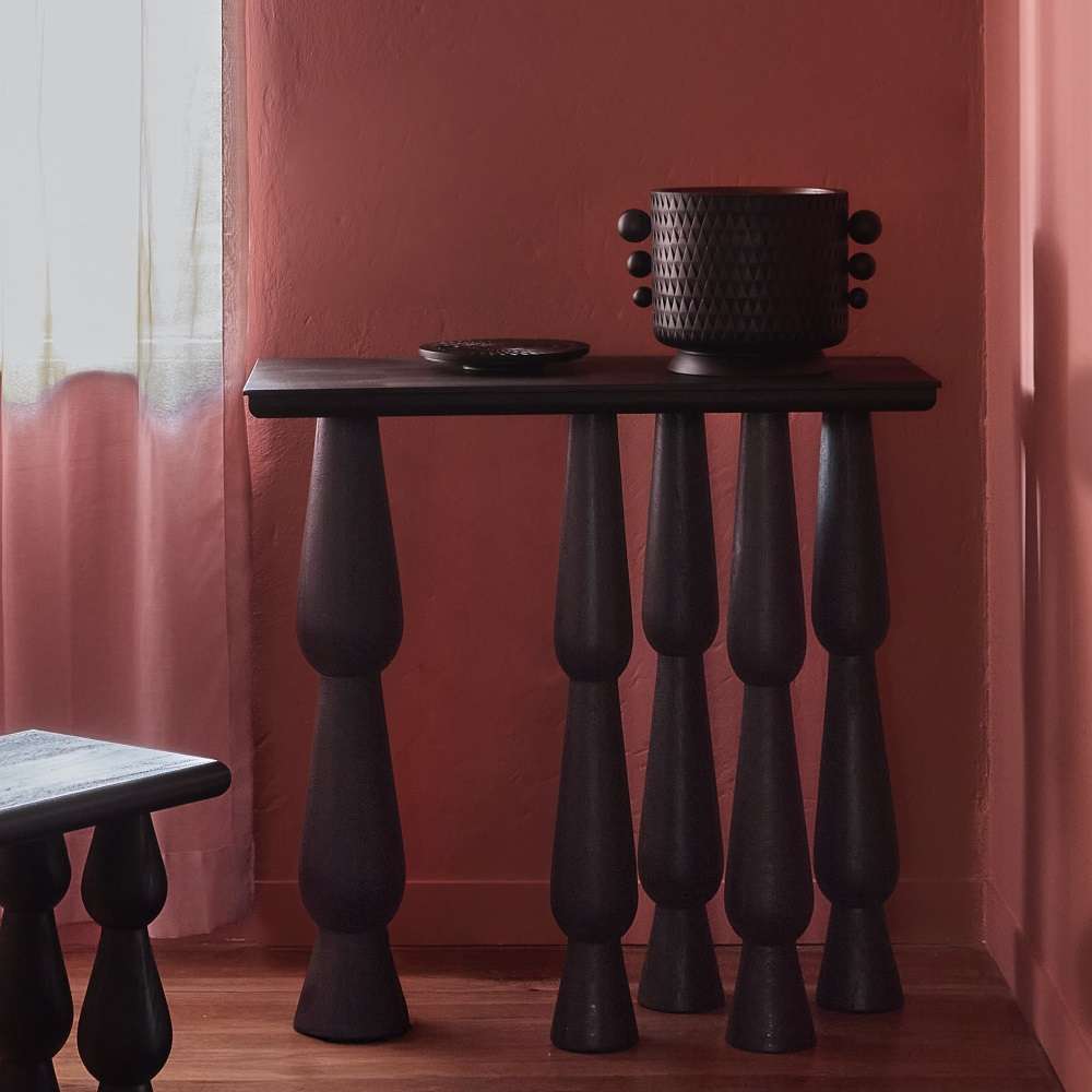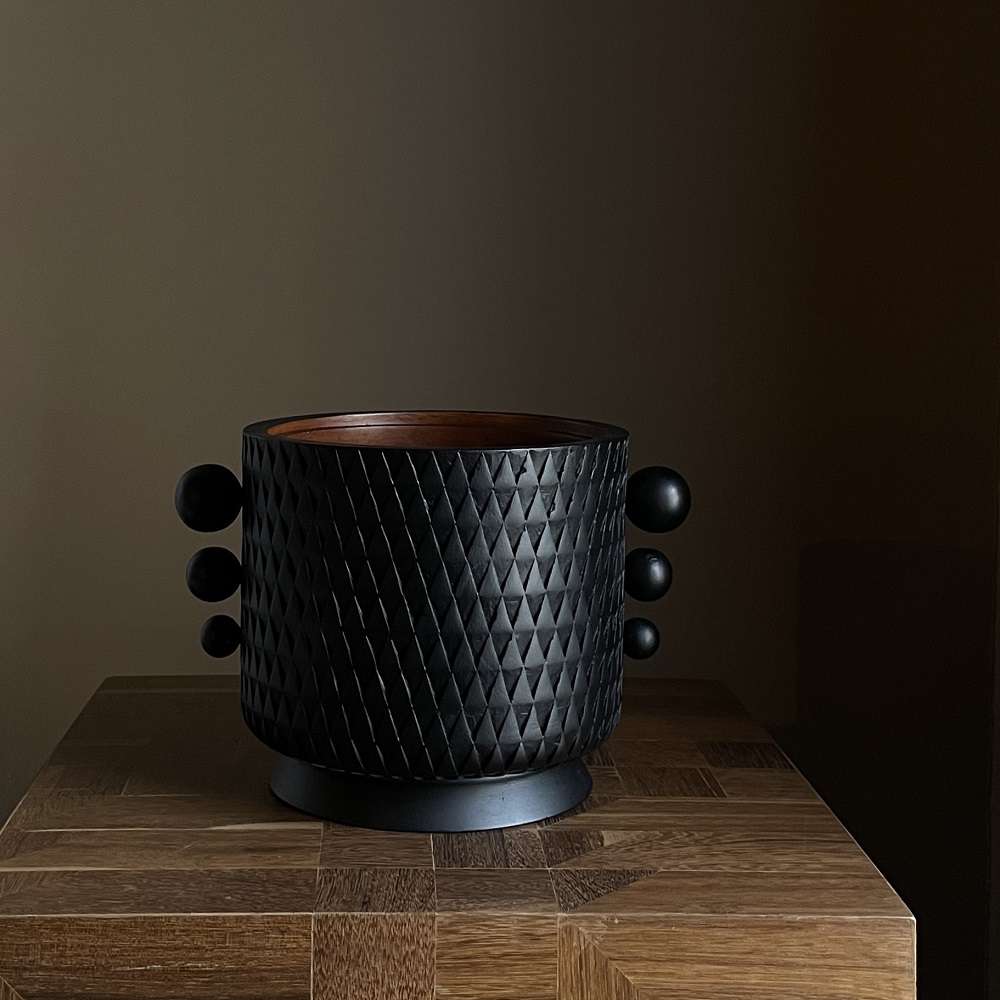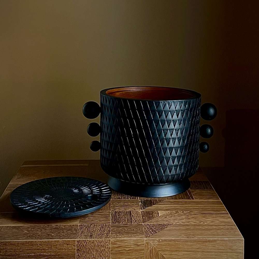 Pieza elaborada en madera cedro del putumayo, torneada y tallada a mano con texturas de patrones geométricos inspirados en la arquitectura.