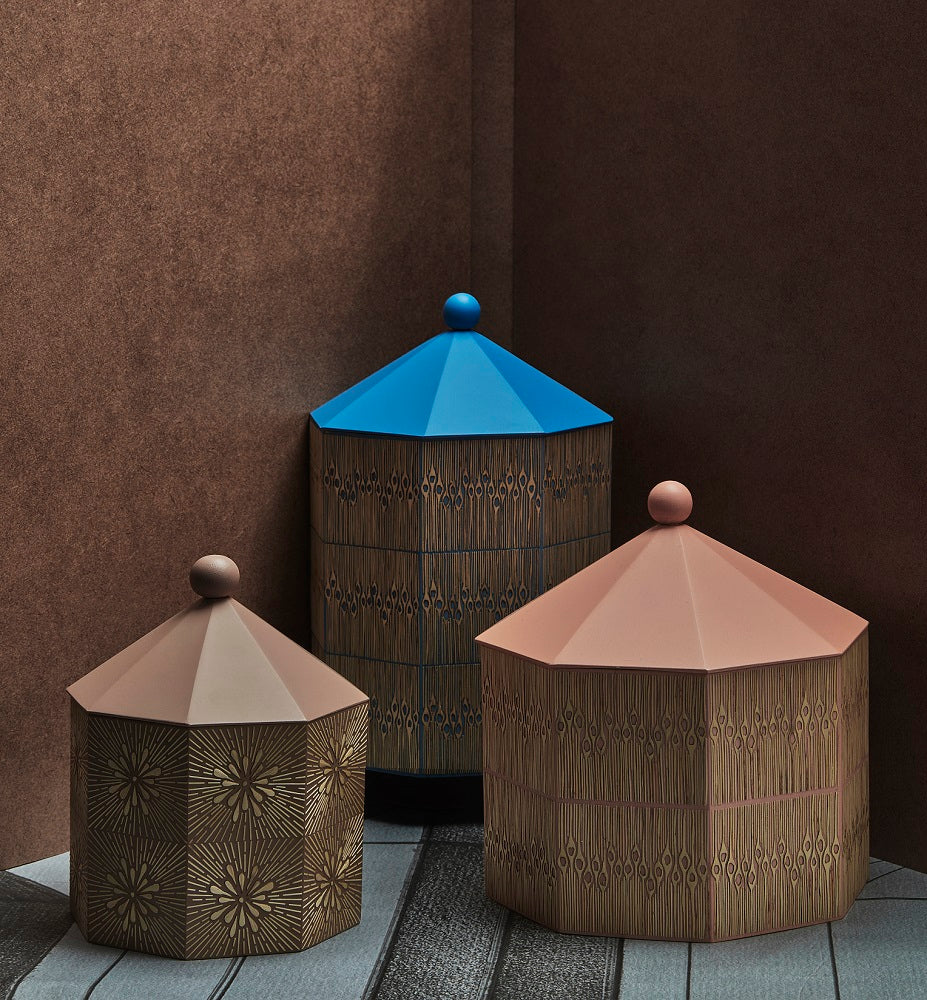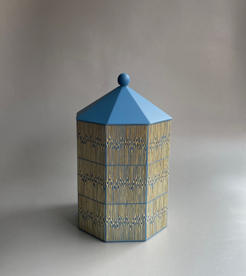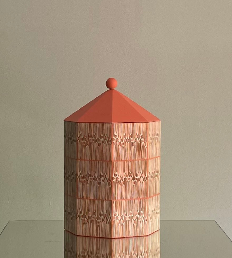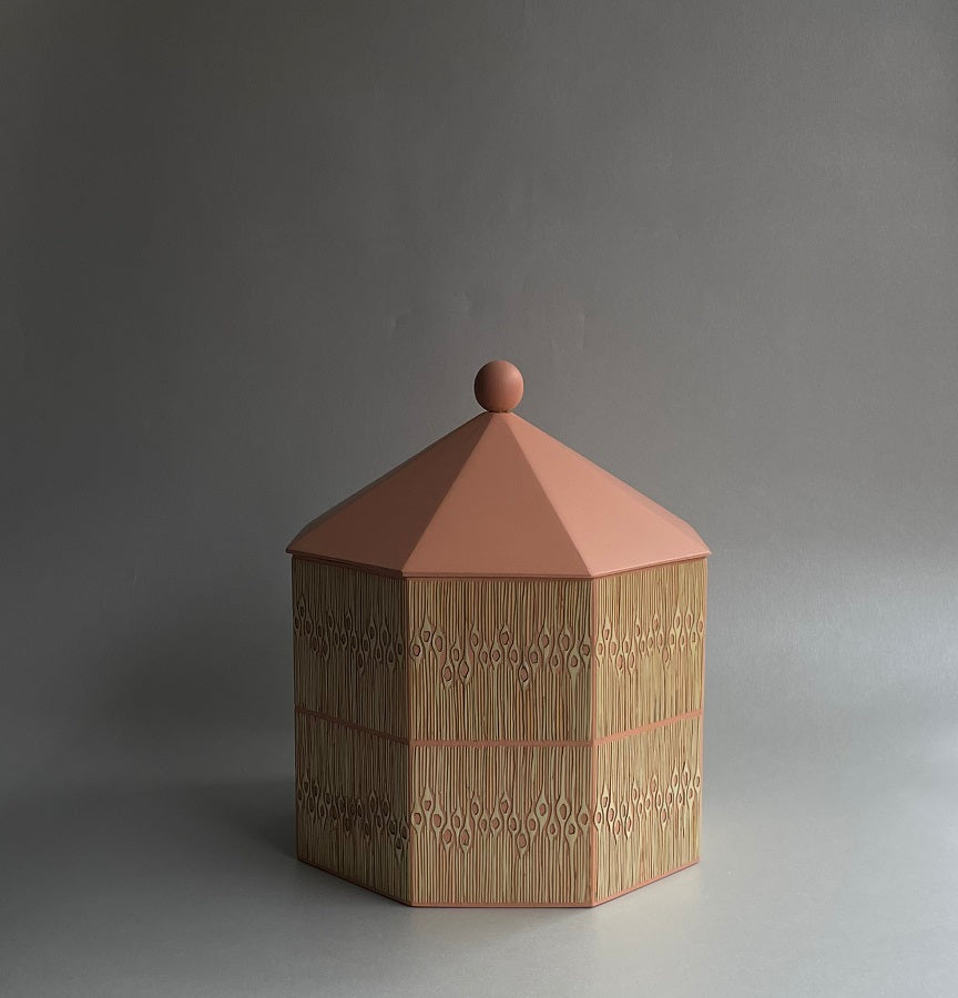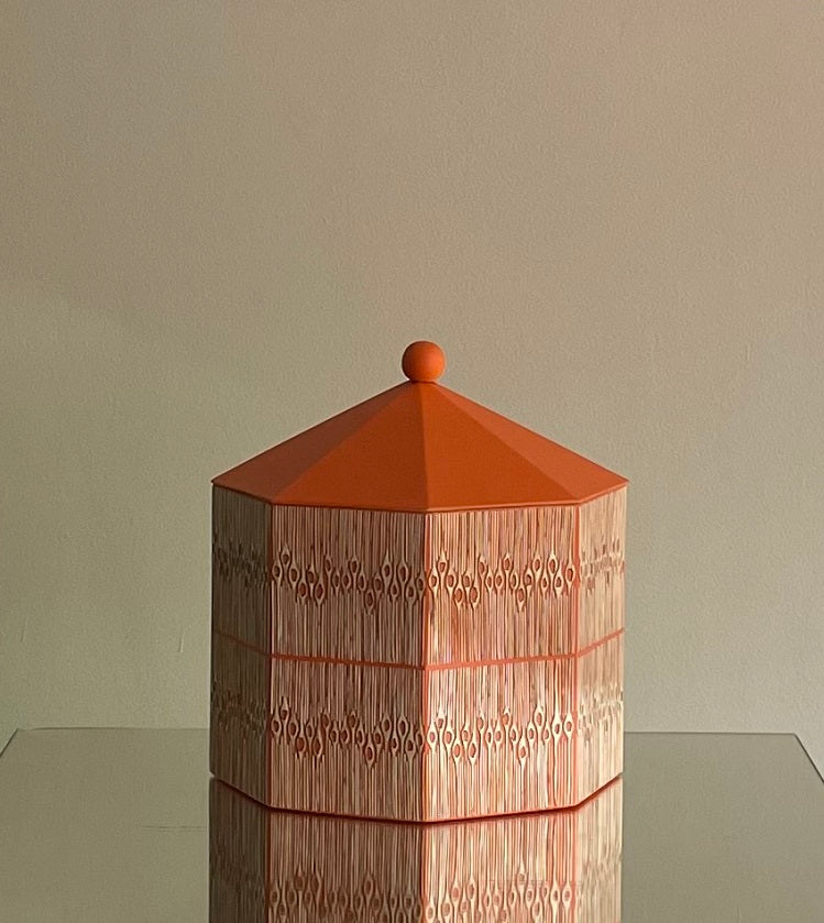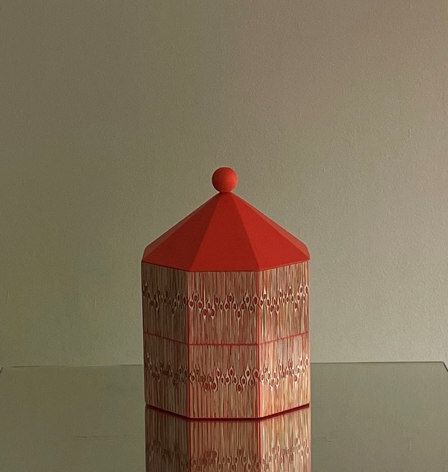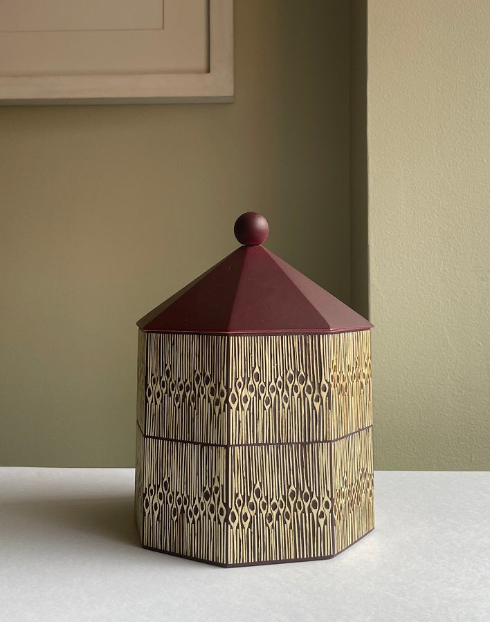 Pieza en madera torneada y enchapada en tamo a mano por artesanos de Pasto, Nariño.
