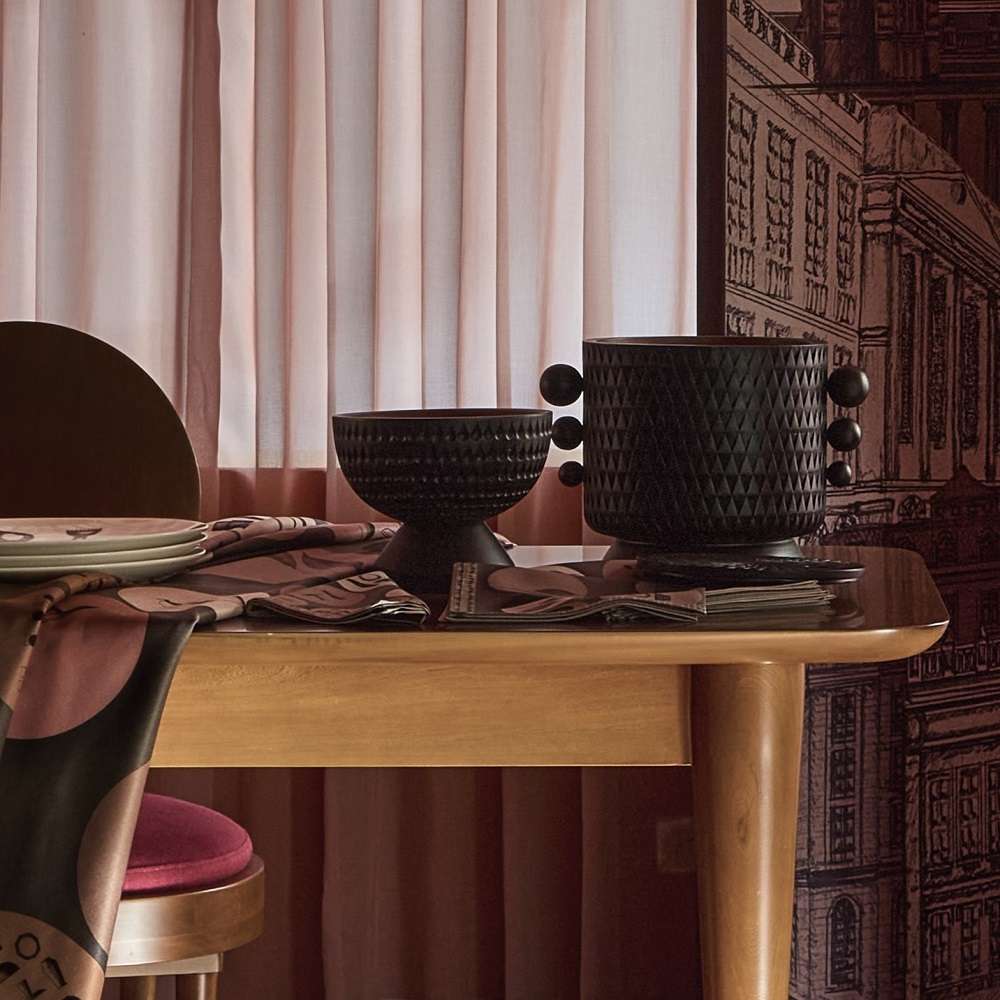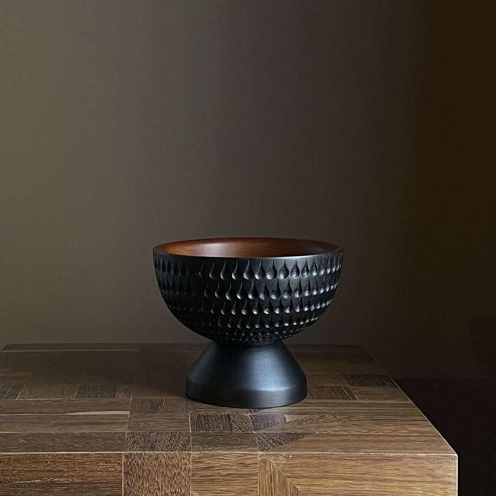 Pieza elaborada en madera cedro del putumayo, torneada y tallada a mano con texturas de patrones geométricos inspirados en la arquitectura.
