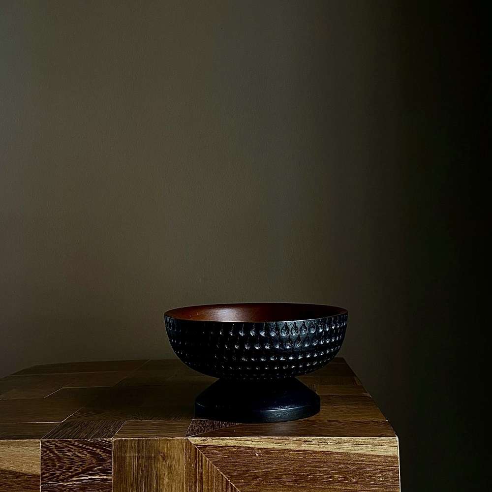 Pieza elaborada en madera cedro del putumayo, torneada y tallada a mano con texturas de patrones geométricos inspirados en la arquitectura.