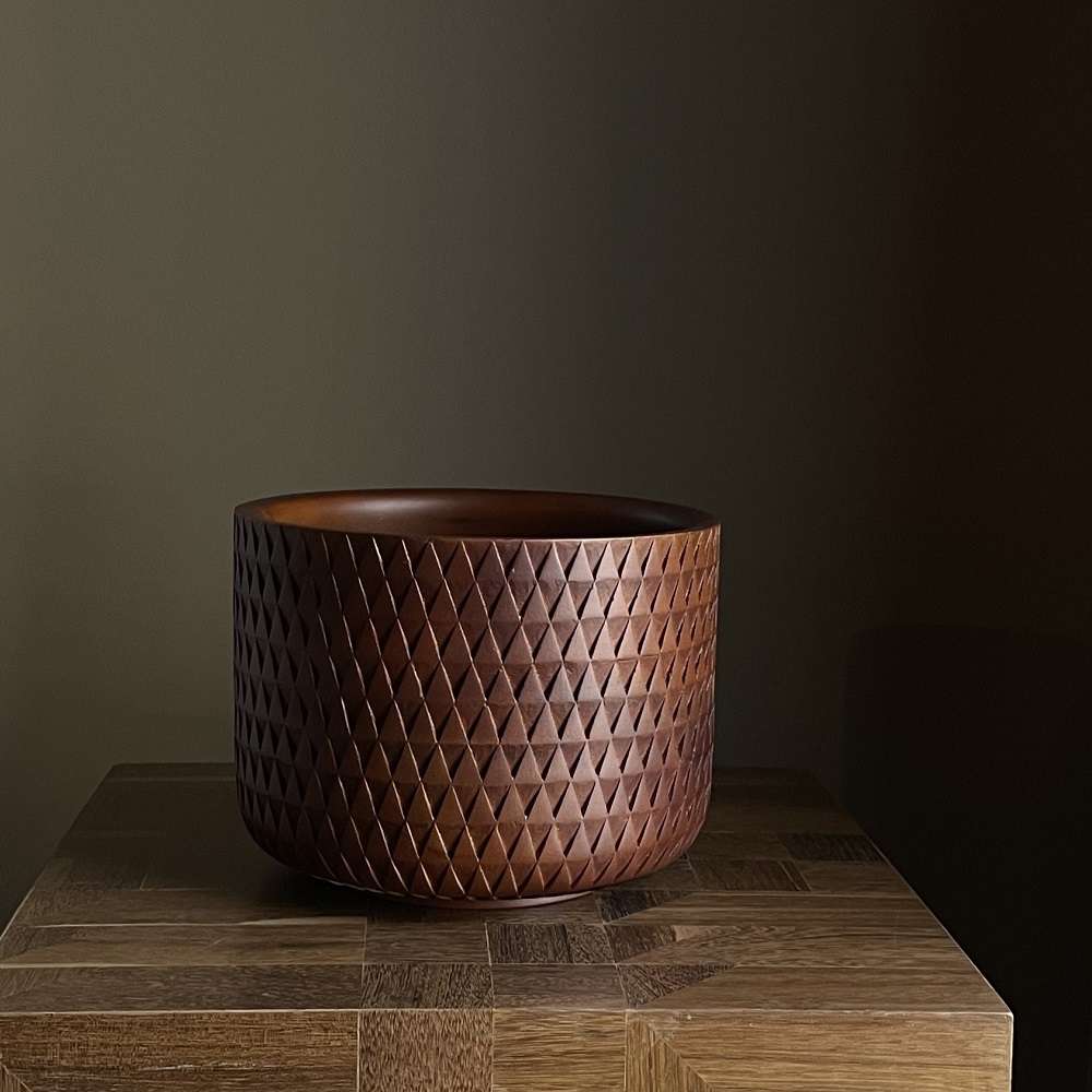 Pieza elaborada en madera cedro del putumayo, torneada y tallada a mano con texturas de patrones geométricos inspirados en la arquitectura.