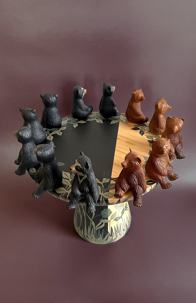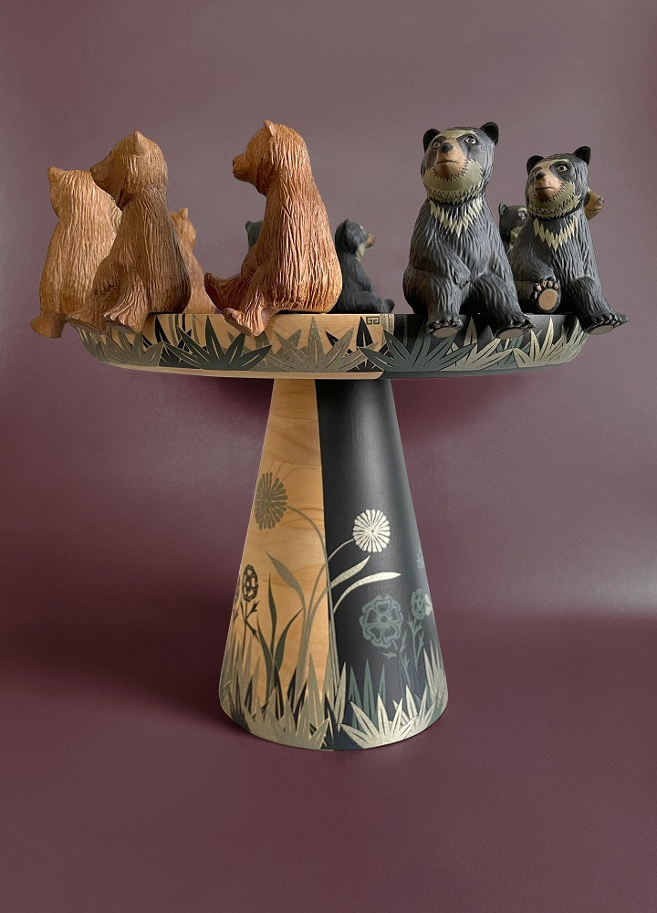 Frutero elaborado en madera torneada, cada oso es una pieza de madera tallada a mano, decorado con la técnica artesanal del Barniz de Pasto - Mopa/Mopa.Pieza de la colección artesanal Selvas Andinas.Tiempo de entrega máximo: 65 días