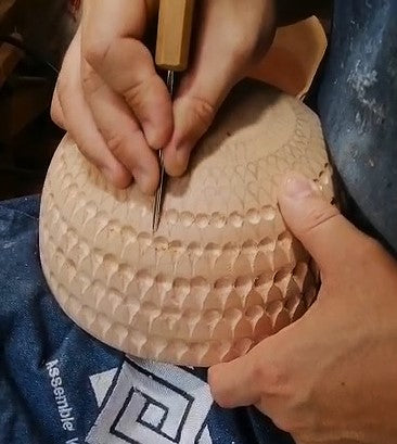 Pieza elaborada en madera cedro del putumayo, torneada y tallada a mano con texturas de patrones geométricos inspirados en la arquitectura. Pieza de la colección ESPACIO, TIEMPO, FORMA Y LUGAR 2025