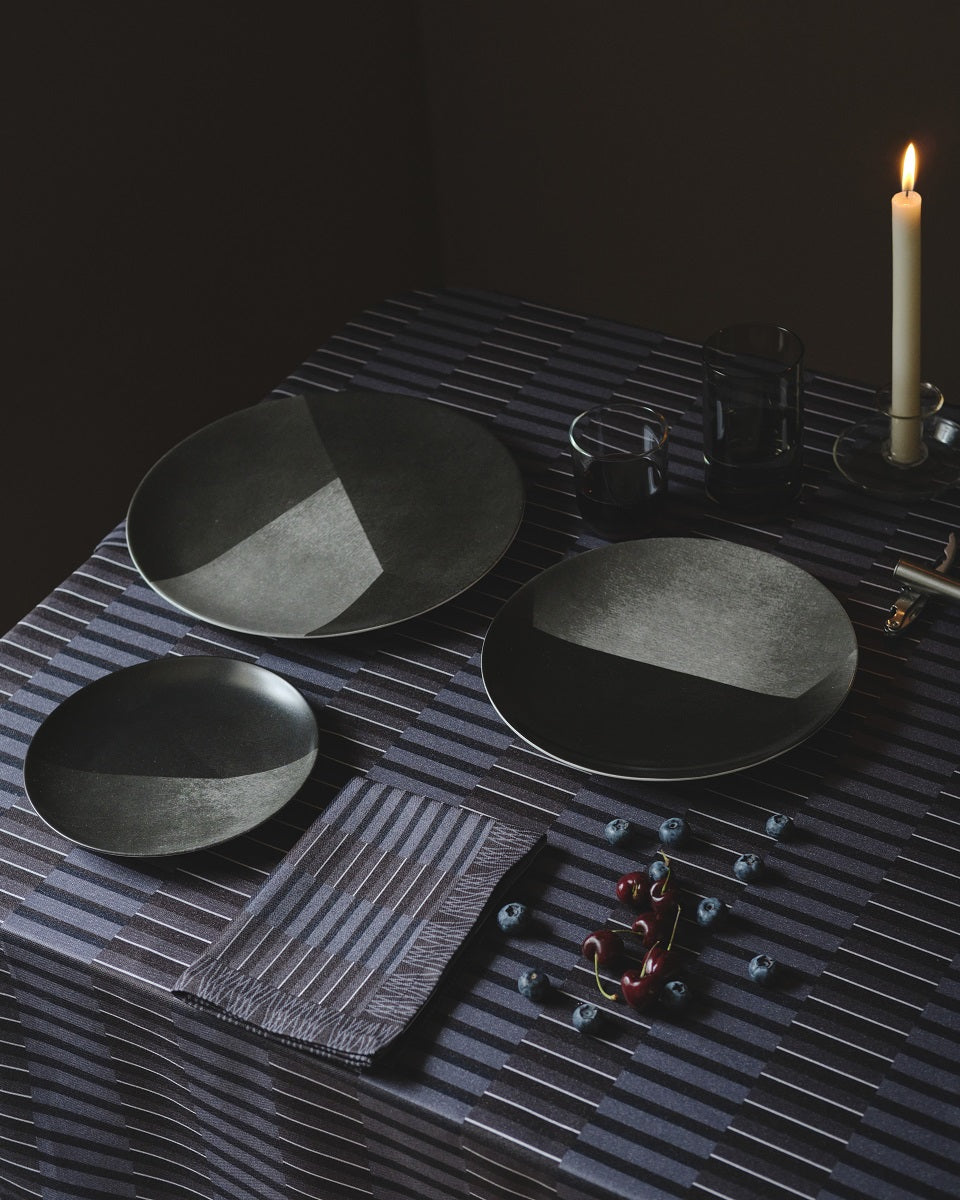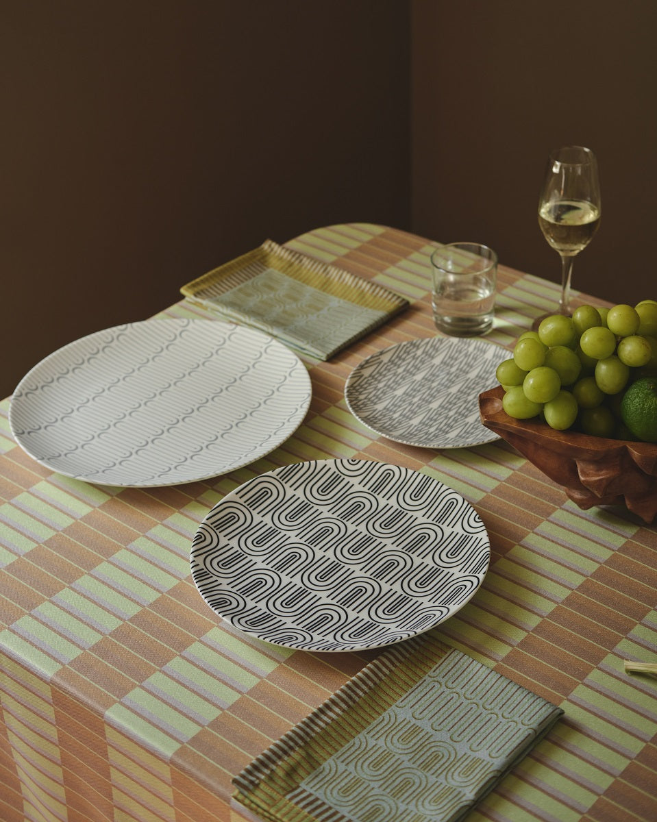 Con la serie de platos en porcelana, manteles y servilletas de esta colección, queremos hacer el relato de cómo la tipología arquitectónica / traducida en FORMA se define por el tiempo en nuestra memoria; iniciamos esta historia, de cómo la arquitectura ha generado códigos y símbolos a través del tiempo, creando UN ESPACIO definido por un lenguaje estético que caracteriza y reconocemos como propios e identificables de un tiempo y un lugar en nuestra memoria colectiva.