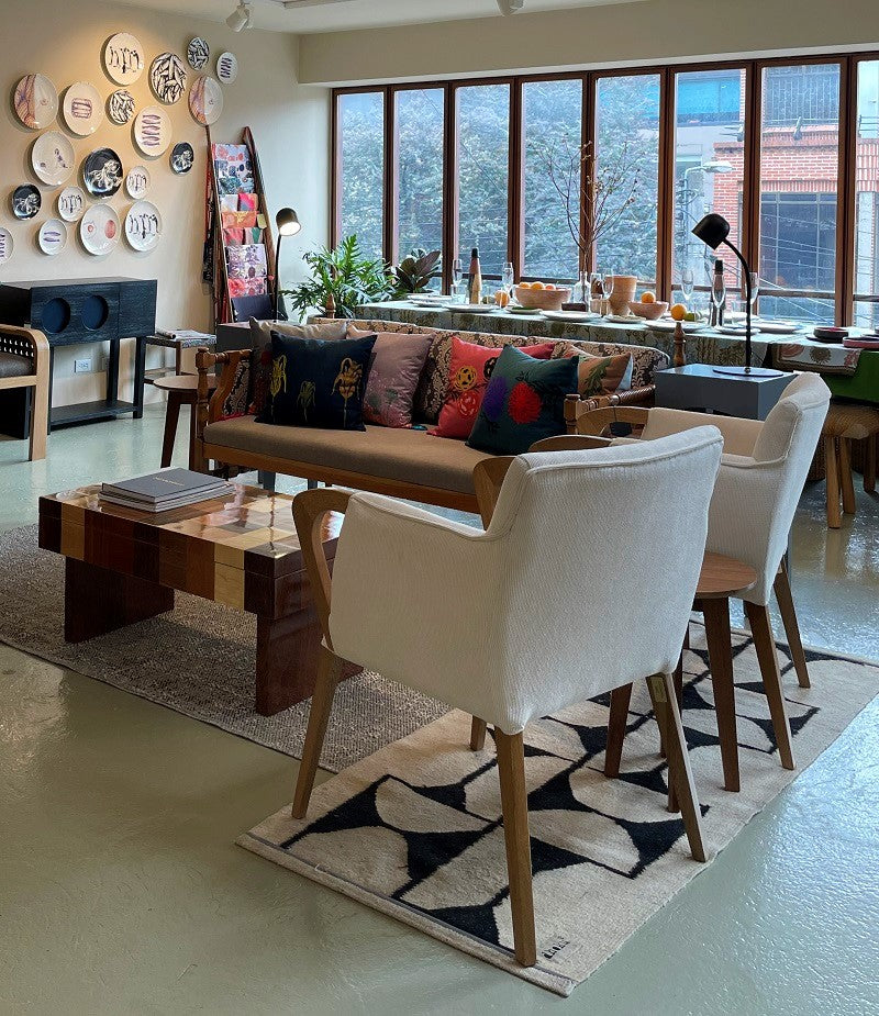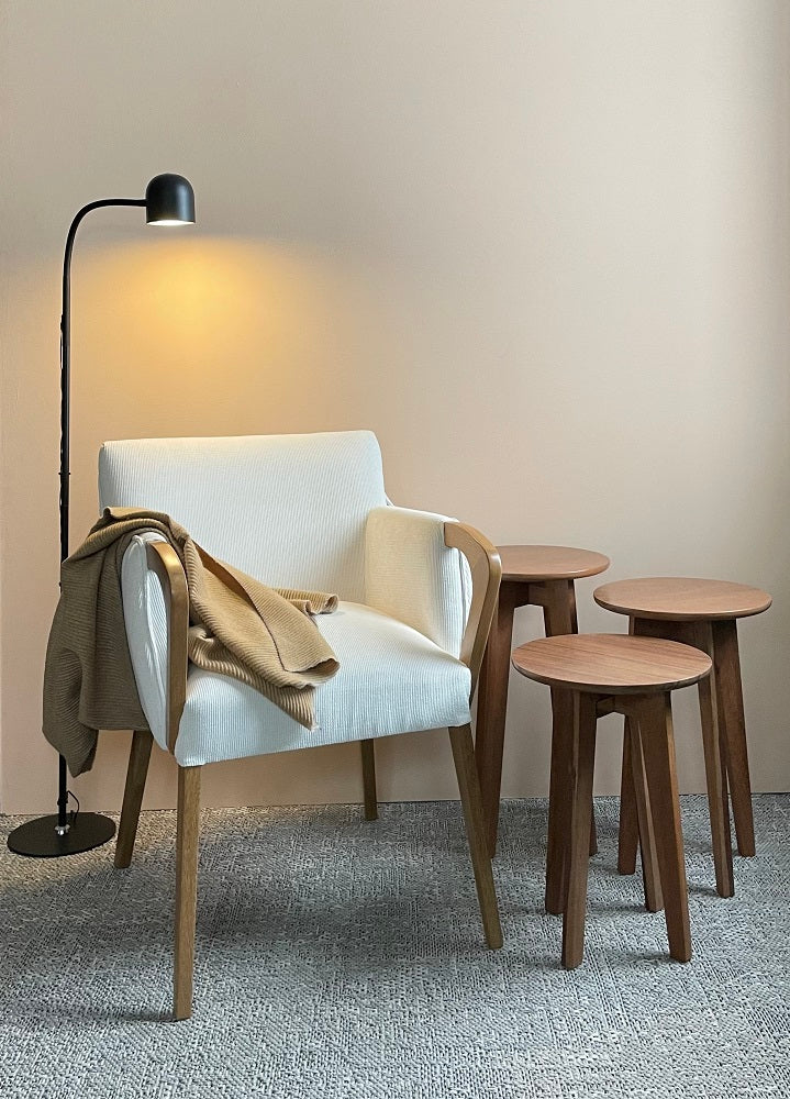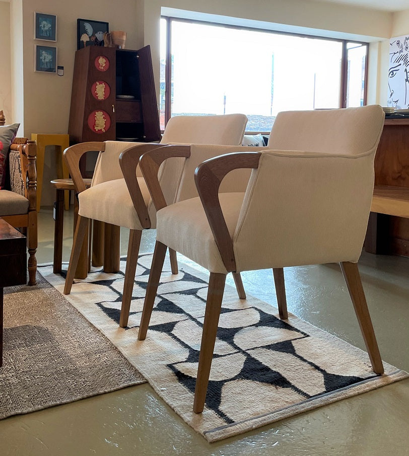 Elaborada en madera Flor morado. Acabado natural en tintilla semi mate, tapizado en tela a elección.