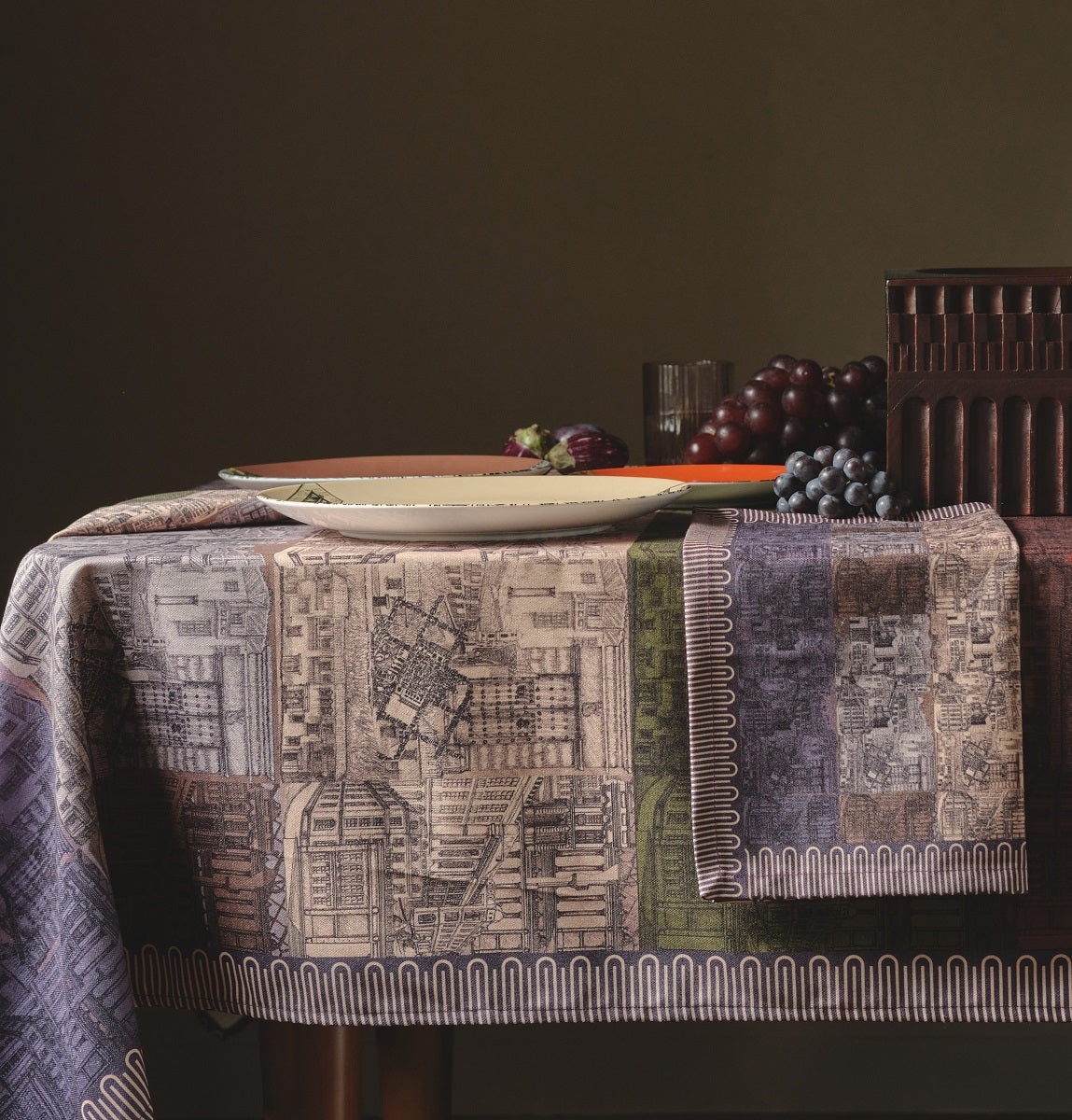Con la serie de platos en porcelana, manteles y servilletas de esta colección, queremos hacer el relato de cómo la tipología arquitectónica / traducida en FORMA se define por el tiempo en nuestra memoria; iniciamos esta historia, de cómo la arquitectura ha generado códigos y símbolos a través del tiempo, creando UN ESPACIO definido por un lenguaje estético que caracteriza y reconocemos como propios e identificables de un tiempo y un lugar en nuestra memoria colectiva.